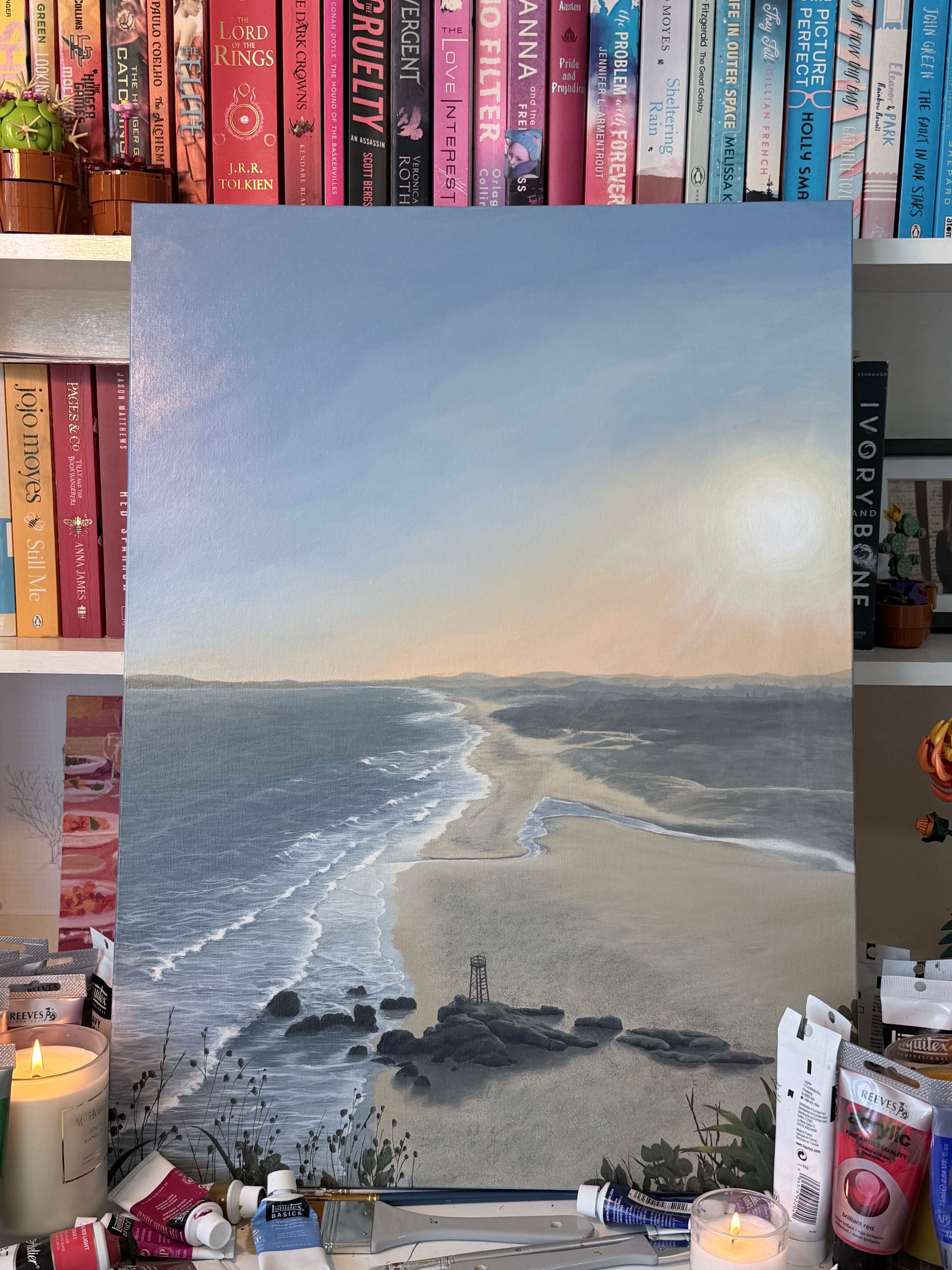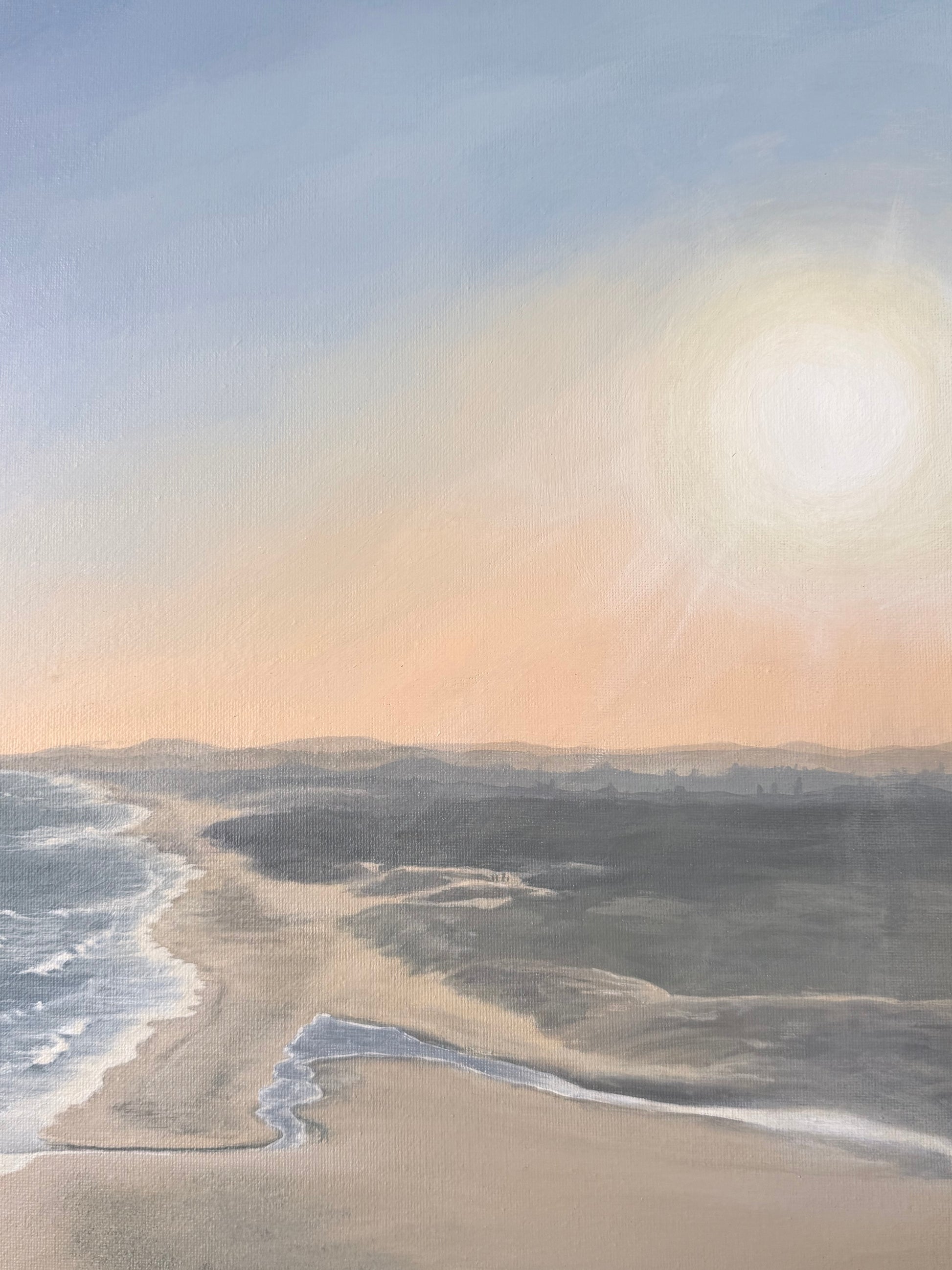 This painting was inspired by Redhead Beach, a place I call home. The shark tower stands as a familiar landmark along the shoreline, watching over countless sunsets, morning walks, and shared memories. For those who live here, this stretch of coast isn’t just a view, it’s part of everyday life and community.